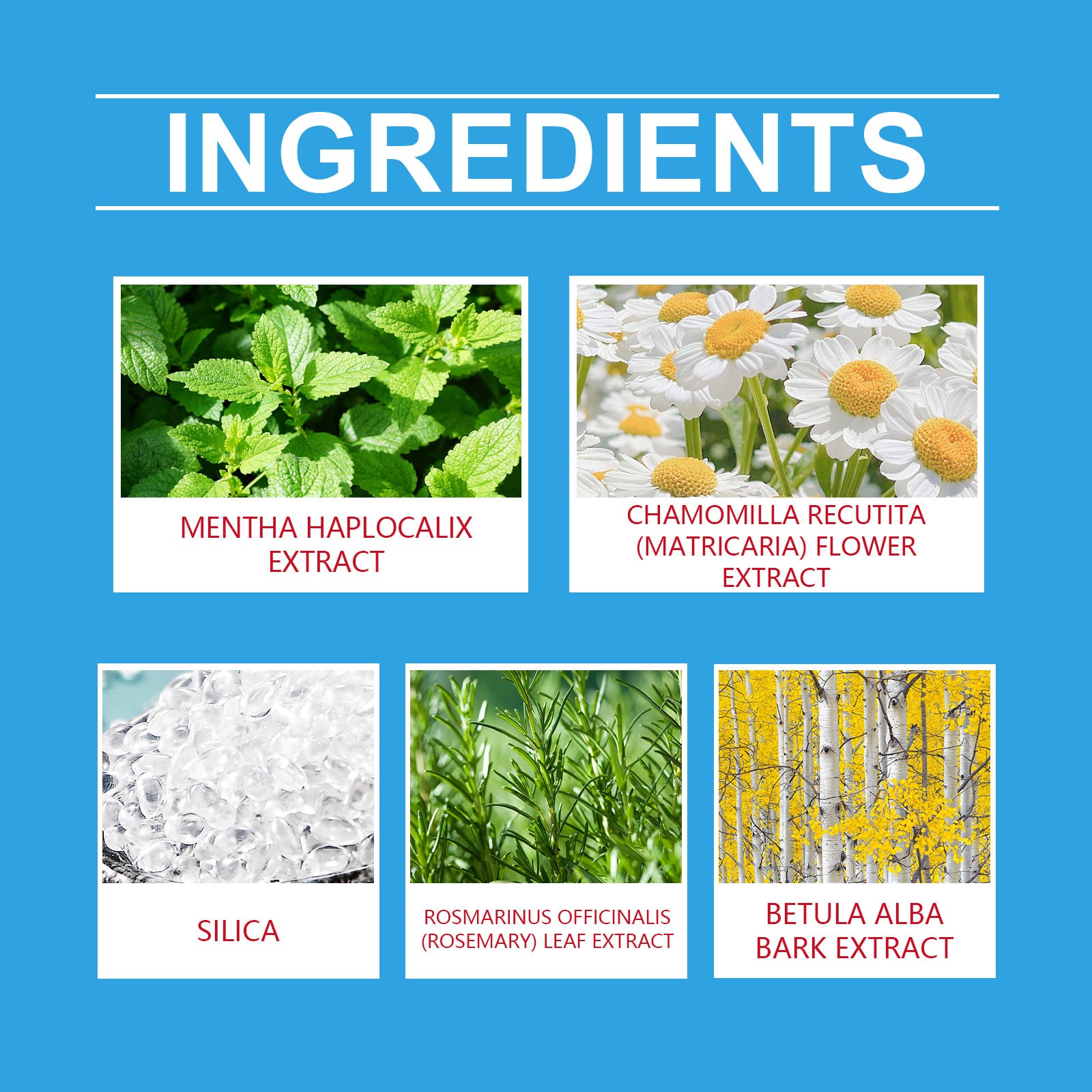 Ingredients: silica, Mint leaf extract, chamomile flower extract, Rosemary leaves extract,
