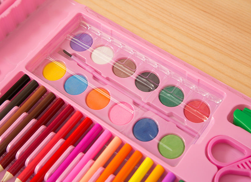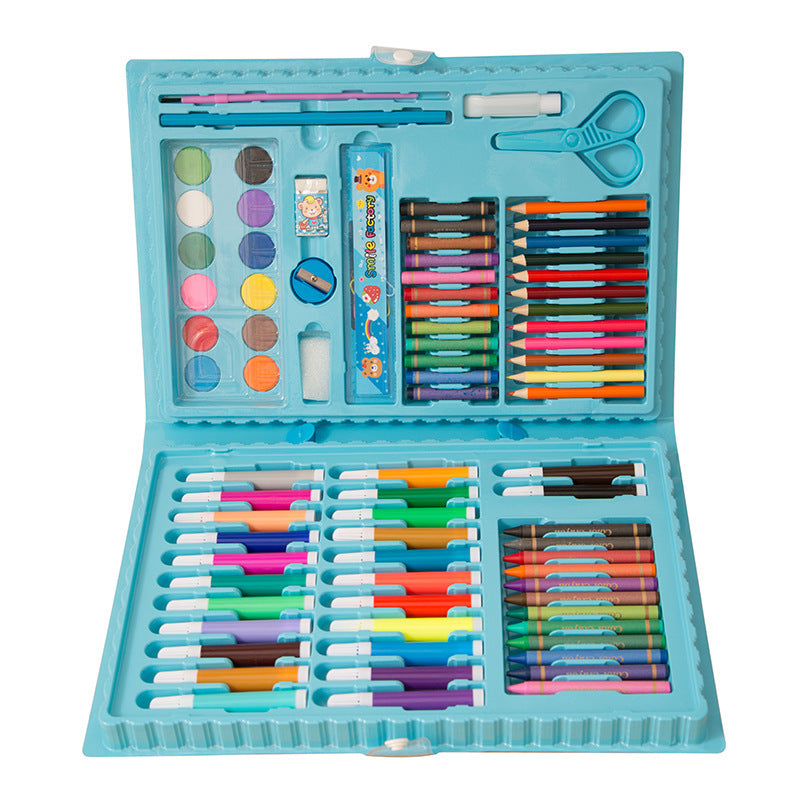 The products include: 24 watercolor pens, 12 crayons, 12 oil painting sticks, 12 color pencils, 12 powder, 5 paper clips, 1 pencil, 1 paint brush, 1 ruler, 1 scissors, 1 sponge, 1 bottle of glue, 1 pencil sharpener, 1 eraser and 1 palette